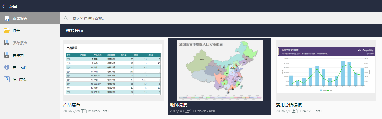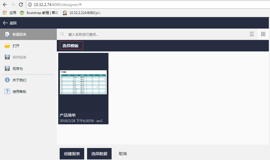 在报表管理页面上,开始设计一个新的报表时,可以选择模板,快速创建一个新报表,如下图: