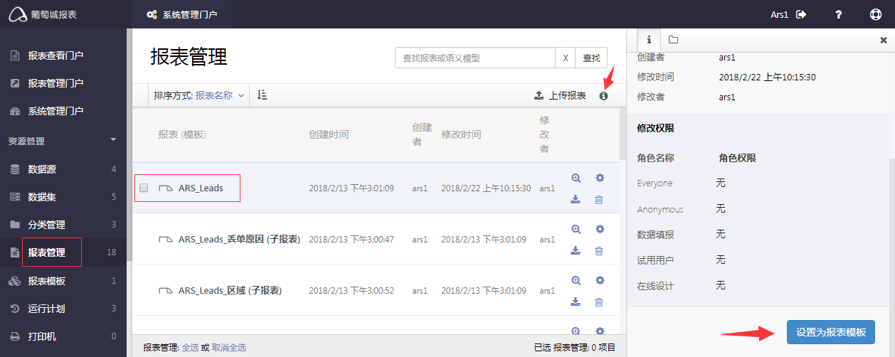 (5)在管理页面的【报表管理】列表中,将该报表设置为报表模板,使之出现在【报表模板】列表中。