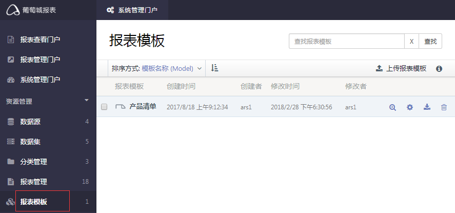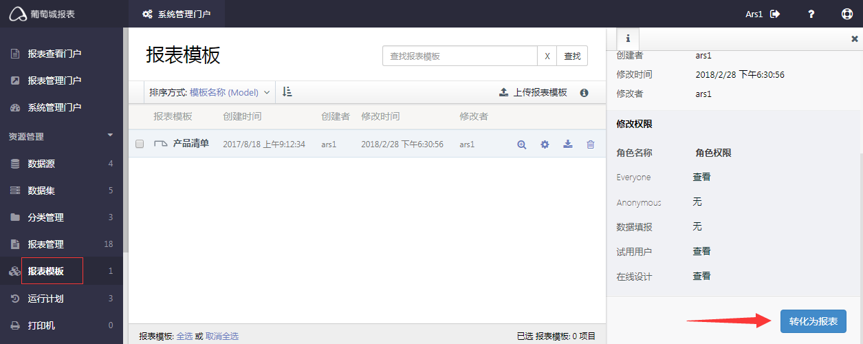 在【报表管理】列表中,点击【】可以将一个普通报表转换为报表模板,如下图:
