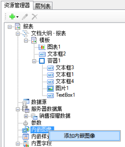 (2)在报表资源管理器中,右键点击【内嵌图片】,再点击【添加内嵌图像】,如下图: