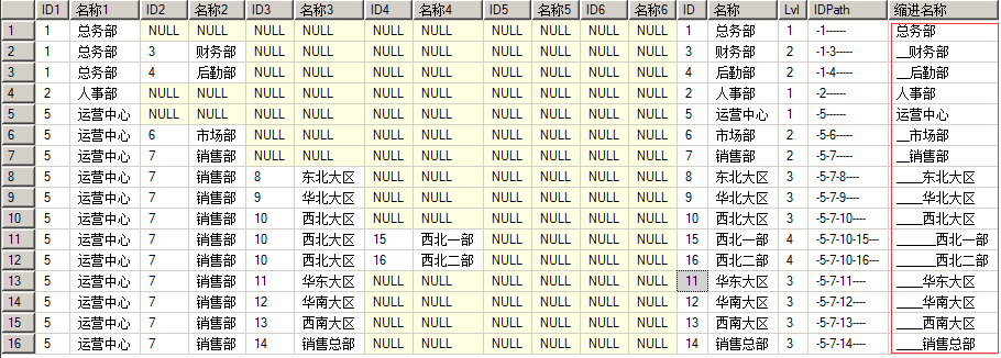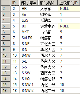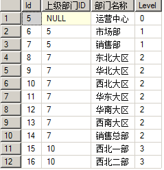 二是结果排序,依赖于ID字段值的数值大小。比如上面的结果中,【西北一部】本应跟在【西北大区】之后,但是按照上级部门ID排序,显示在【销售总部】之后了。即使按照其他字段来排序,也是无法将【西北大区】的下级部门都紧跟在其后的。