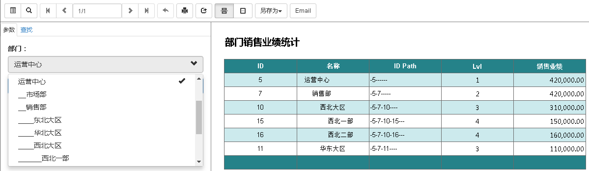 采用上述方法定义部门参数、查询销售业绩的统计表效果如下图: