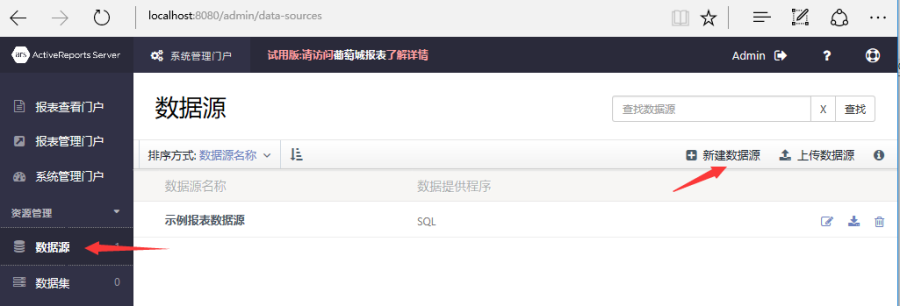 登录成功后,选择左侧菜单栏的【数据源】,再点击画面中部数据源列表右上方的【新建数据源】,如下图: