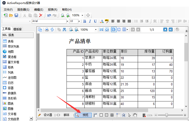 报表设计区下部,有三个选项卡:设计器、脚本、预览。默认状态为【设计器】选项卡。点击【预览】,可查看报表的效果,如下图: