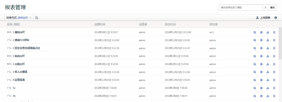报表管理支持报表预览、报表编辑、报表下载、上传及删除报表功能。上传报表 将设计好的报表上传到报表服务器。