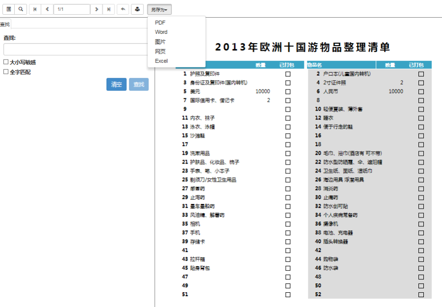 预览报表 在网页上预览上传到服务器端的报表,支持预览时支持报表导出,导出格式支持PDF、图片、网页、Word、Excel等五种格式。