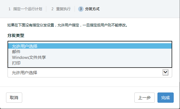 (5)指定本计划的分发方式,即在用户使用本计划自动生成报表时,是否限制生成的报表以何种方式分发,如下图: