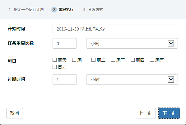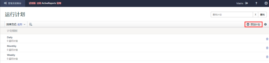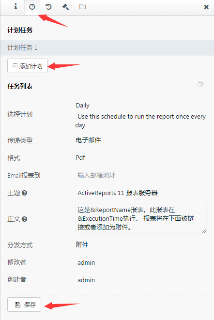 (2)点击钟表形图标,页面将显示该报表的计划任务。点击【添加计划】按钮,可将新的运行计划应用到该报表,即按照新的时间周期自动生成该报表,并以指定的方式分发出去。如下图: