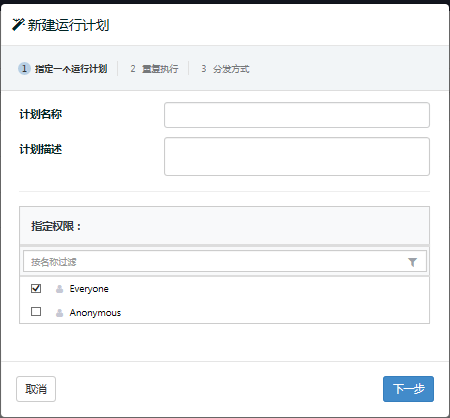 (3)输入计划名称、计划描述,勾选允许使用此计划的角色,点击【下一步】,如下图:
