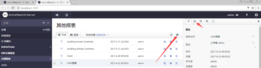 (1)在报表管理门户(http://localhost:8080)页面选中某个报表,再点击右上角的i形图标,页面右侧将显示该报表的属性。如下图: