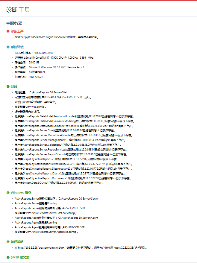 记录和跟踪报表服务器的所有配置信息。可查看系统的配置信息和运行状况,比如是否完成了所有配置、有无系统文件版本冲突等。如下图: