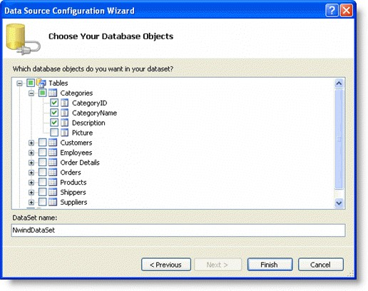 该向导可以保存和命名你在"保存连接字符串到应用程序配置文件"页面上的连接。在此页面上,你可以指定一个名称或使用该向导提供的默认。在 "选择数据库对象"页面上,你可以指定你要在"数据集"中包括的表和字段。你也可以为你的"数据集"提供一个名称或使用向导提供的默认。