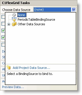 无需编写一行代码,你可以通过在 Visual Studio 中使用数据源配置向导,很容易地将 C1FlexGrid 绑定到一个数据源。要访问该向导有以下两种途径,可以通过在属性窗口中选择"数据源"属性,或通过 C1FlexGrid 任务菜单中的