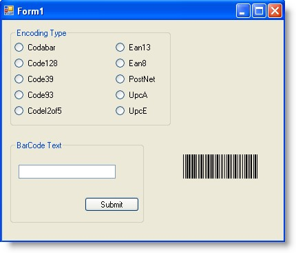 - 选择不同的单选按钮改变编码类型,您可以注意到C1BarCode条形码的外观将发生变化。