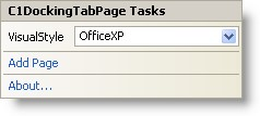 Office2003Olive,Office2003Silver,OfficeXP,Classic,以及WindowsXP),以设置标签的外观样式。请注意, C1DockingTab.VisualStyle以及VisualStyle枚举取代了LookAndFeel属性以及LookAndFeelEnum枚举,它们已经被废弃。添加页面