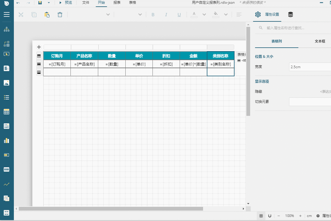 3. 选中第一列,设置列的【隐藏】属性,选择【表达式】