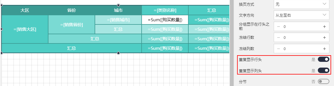选中整个矩表,在右侧属性设置面板中找到“重复显示行头”和“重复显示列头”两个属性。然后通过单击属性右侧的开关按钮来控制是否每页都重复显示。