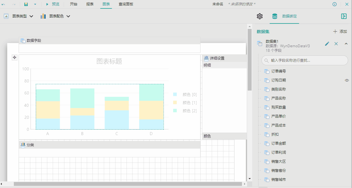 选中图表组件后,会在图表上方、下方和右方显示三个字段绑定区域:数据字段、分类和详细设置。