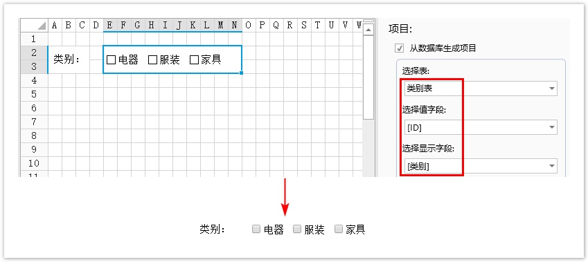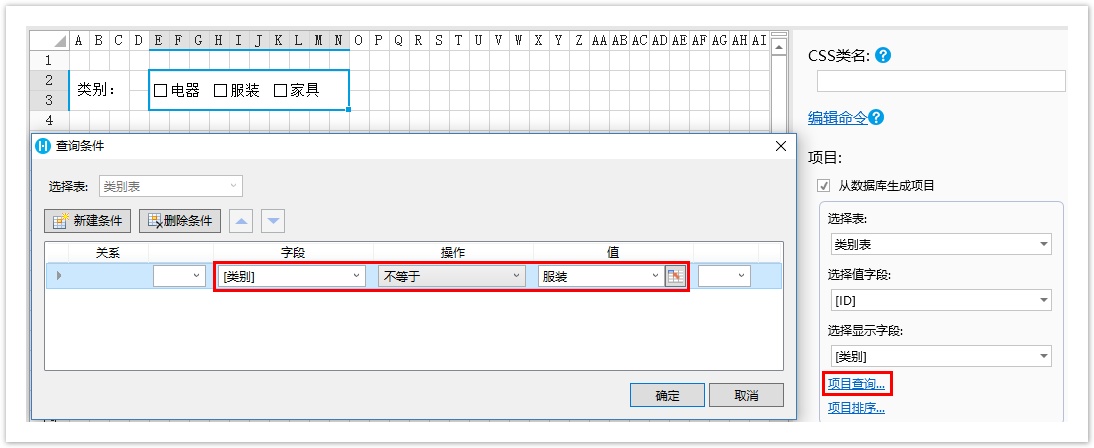例如,设置单元格为组合复选框,勾选“从数据库生成项目”,选择数据表、值字段、显示字段。单击“项目查询”,设置查询条件,字段为“类别”,操作为“不等于,值为“服装”,如下图所示。