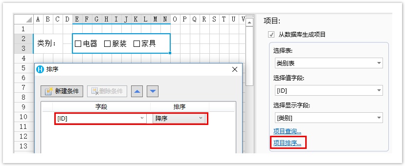 例如,设置单元格为组合复选框,勾选“从数据库生成项目”,选择数据表、值字段、显示字段。单击“项目排序”,设置排序条件,字段为“ID”,排序为“降序”,如下图所示。