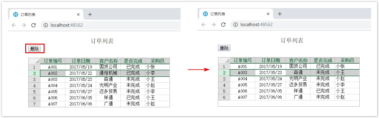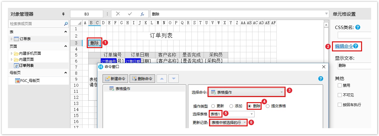 例如,在订单列表页面中单击“删除”按钮删除表格中的数据,可使用表格操作命令。