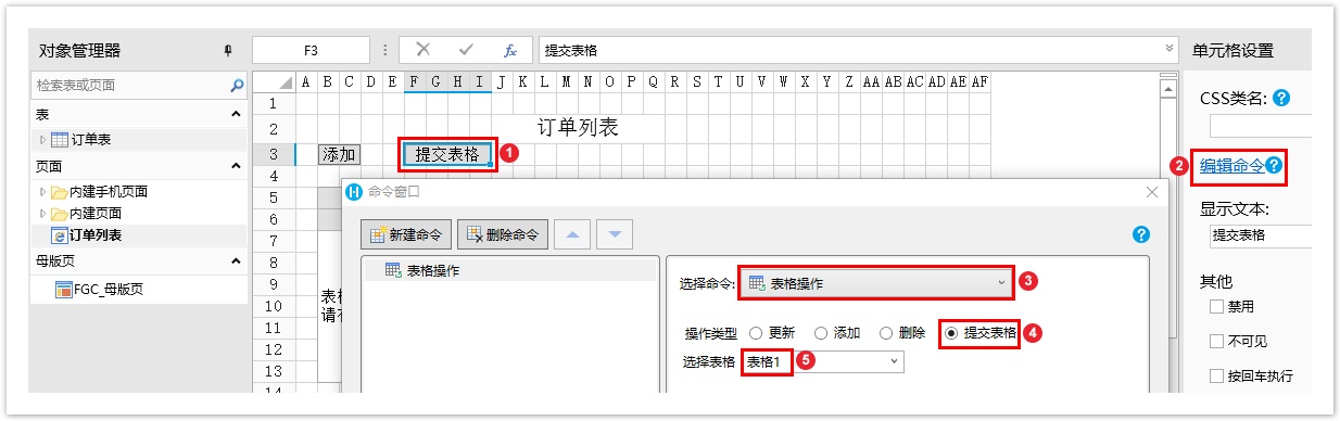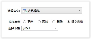 要将表格中的数据变更提交到数据库,需要再添加一个“提交表格”的按钮,设置其命令为“表格操作”,操作类型为“提交表格”,并选择数据要提交的表格,如下图所示。