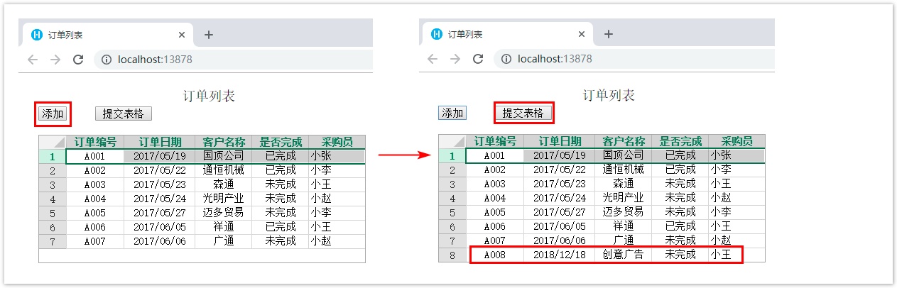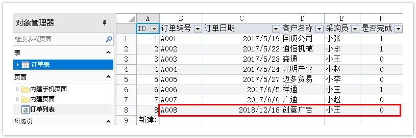 例如,在订单列表页面单击“添加”按钮可向表格中添加一条数据,但此时添加的数据不能立即提交到数据库中,具体操作请参见操作类型-添加