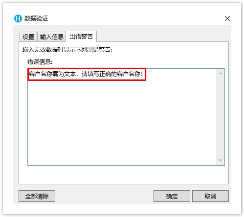 (可选)您可以设置输入信息和出错警告。例如选择“出错警告”,设置当输入无效数据时显示的出错警告,如下图所示。