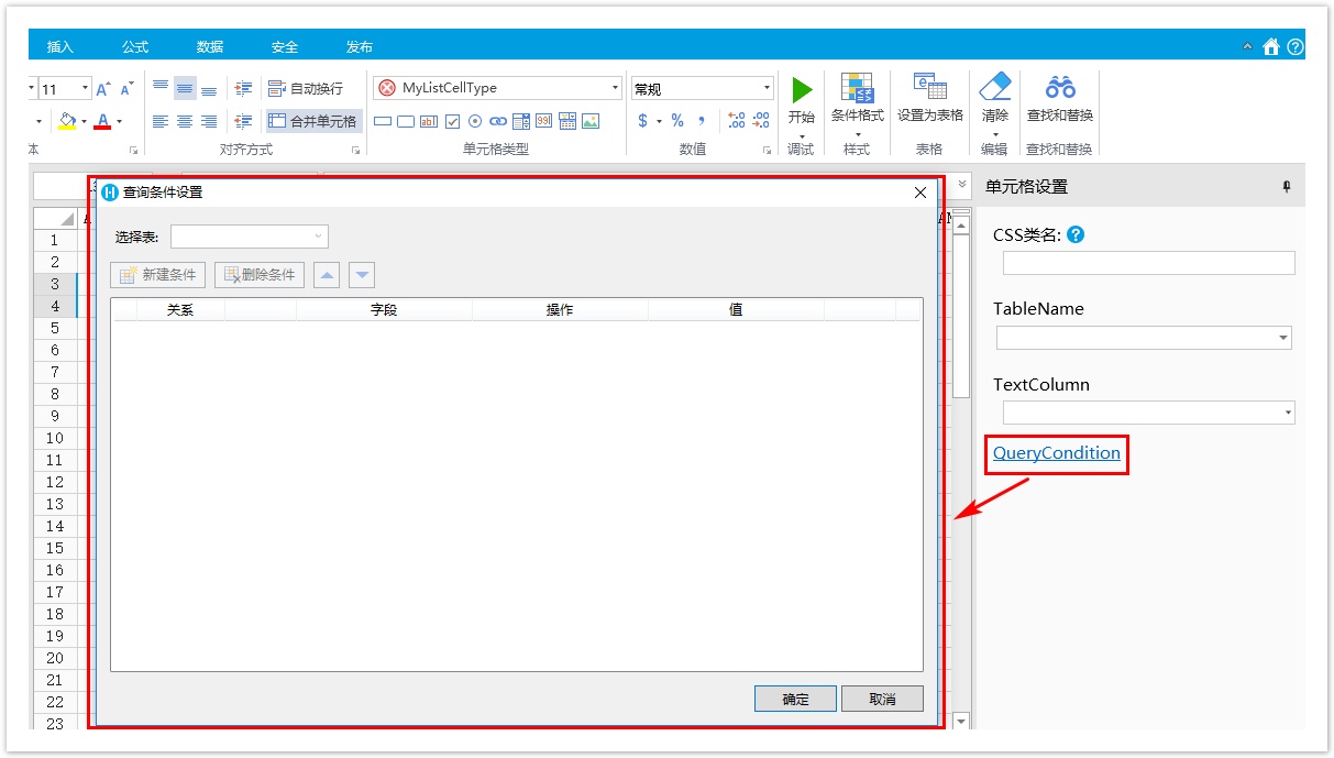 重新构建工程并重启设计器,选择单元格并设置其类型为新创建的“MyListCellType”,单击单元格设置中的“QueryCondition”,则会弹出“查询条件设置”窗口,如下所示: