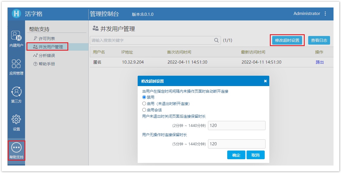 在“帮助支持->并发用户管理”页面,单击“修改超时设置”,在弹出的页面中修改超时设置。