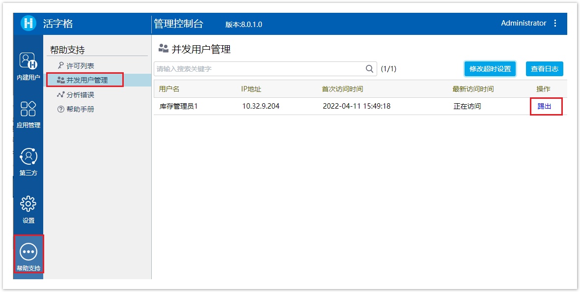 管理用户登录状态。所有用户都会在“帮助支持->并发用户管理”页面中列出,管理员可以单击“踢出”来强制踢出任何登录用户。用户被踢出后,需要重新登录应用。