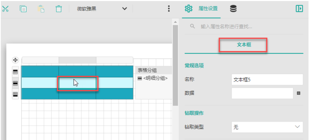 当我们选中单元格后,表格也就进入了编辑状态,此时可对单元格内的组件进行属性设置,如调整背景色、字体、设置钻取等。