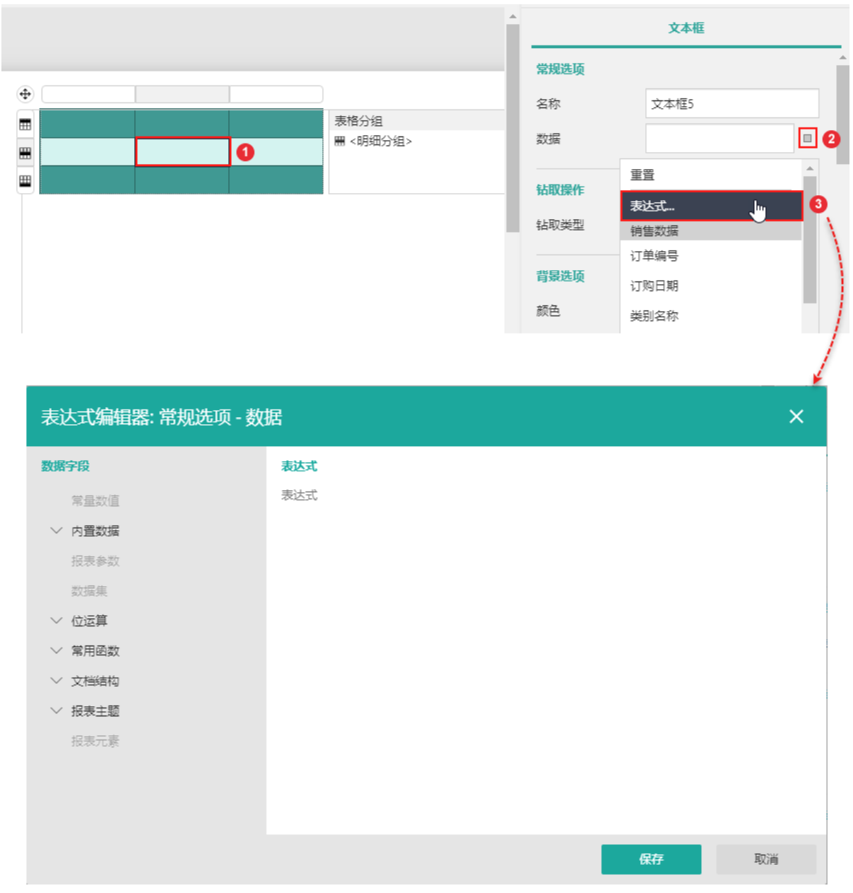 方法二: 单击选中单元格,在属性设置面板中单击“数据”后的小方块,然后选择“表达式”。