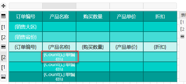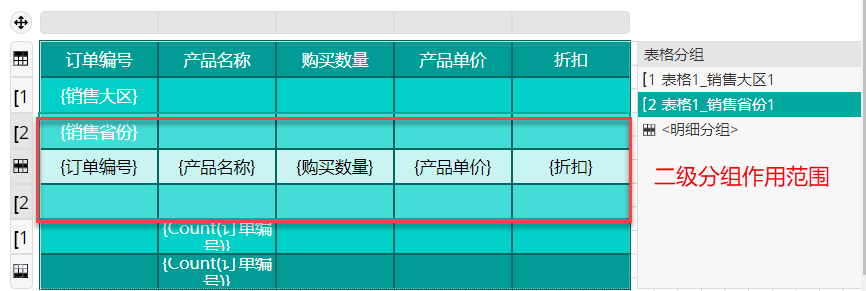 二级分组头已经自动绑定分组字段“销售省份”。将二级分组尾也绑定“订单编号”字段(系统会自动进行计数运算)。如下图所示。