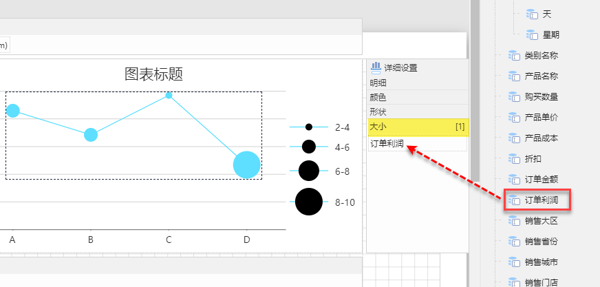 然后,将“订单利润”绑定到详细设置中的“大小”,使折线图中的折点大小来表示订单利润情况。
