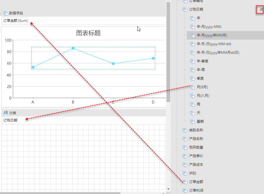 将数据集中的“订单金额”和订购日期中的“月”拖拽至图表的数据字段绑定区和分类绑定区。