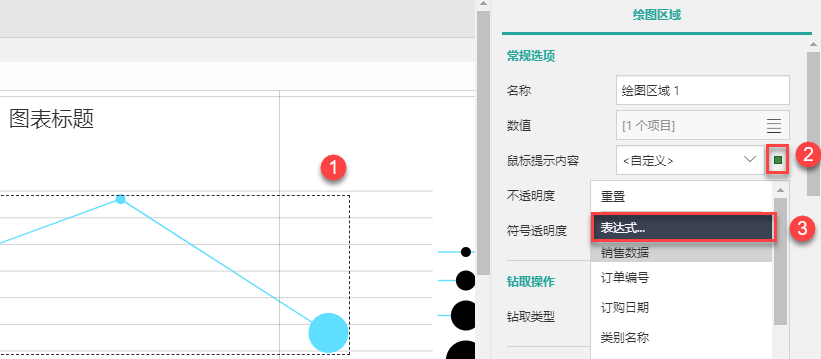 选中图表中心的绘图区域,在属性设置面板中找到“鼠标提示内容”设置项。单击右侧的小方块,选择“表达式”。