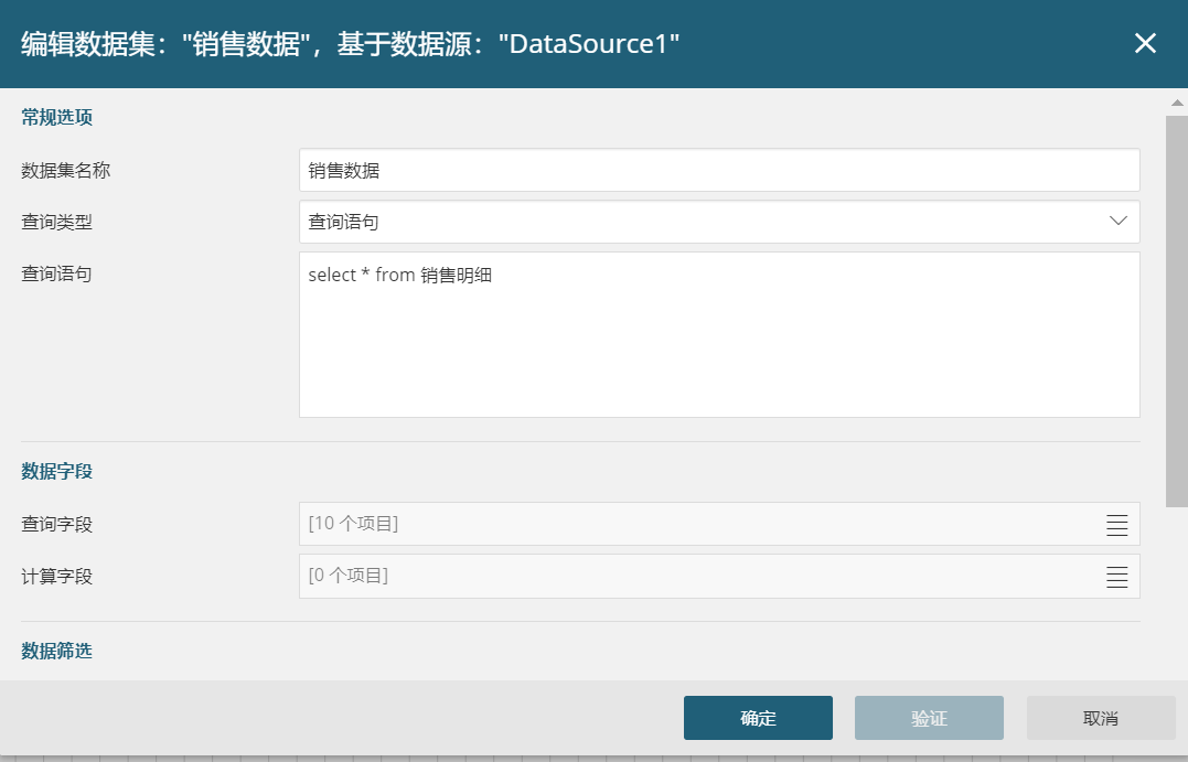 设置数据集名称为“销售数据”,在“查询语句”中输入SQL语句:select * from 销售明细。单击“验证”,您将看到“查询字段”处显示字段数目。最后单击“确定”保存数据集定义。