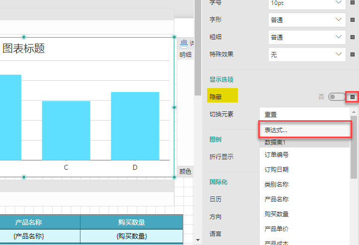 (3) 选中图表组件,在属性设置面板中找到“显示选项”下的“隐藏”设置项,单击右侧的小方块,然后选择“表达式”。
