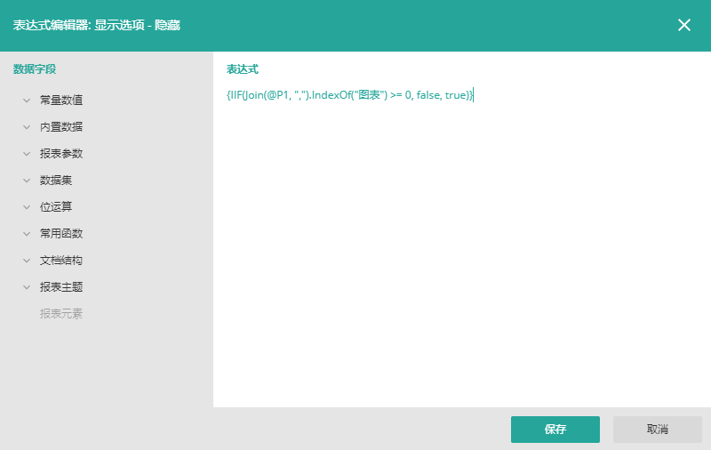 (4) 在表达式编辑器中输入表达式: {IIF(Join(@P1, ",").IndexOf("图表") >= 0, false, true)}。