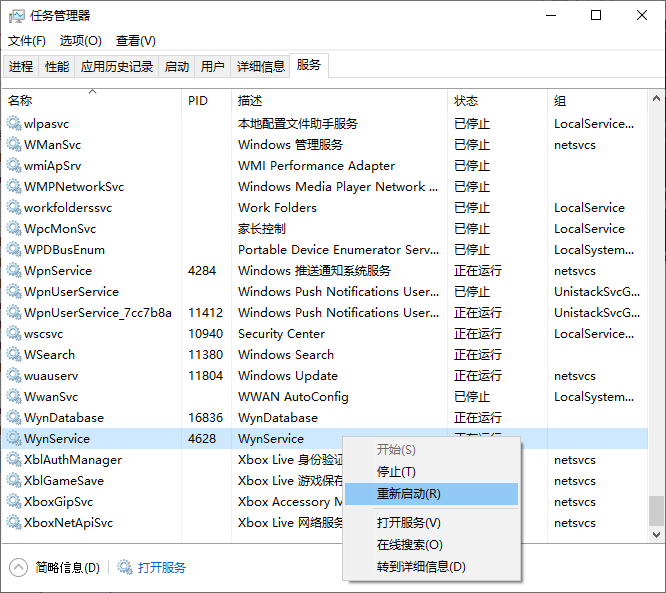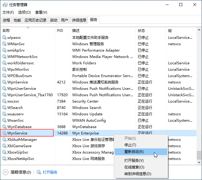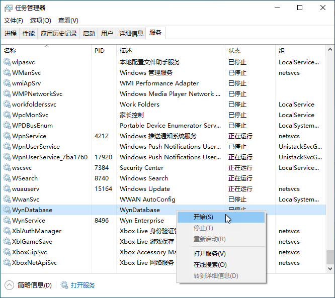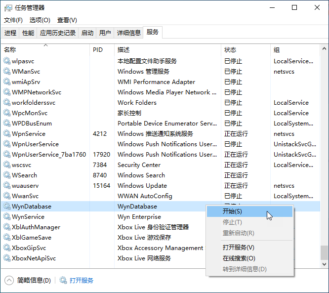 (1) 打开任务管理器,切换至“服务”窗口。找到“WynDatabase”,右键单击并选择“开始”。