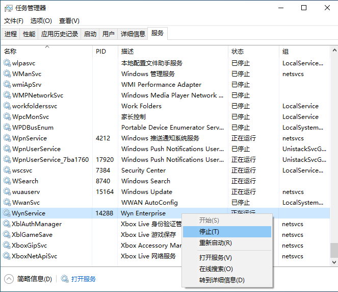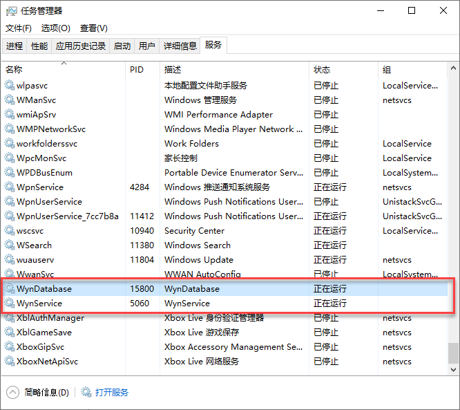 Wyn 的两个服务(WynDatabase和WynService)应处于【已启动】或【正在运行】状态。如下图: