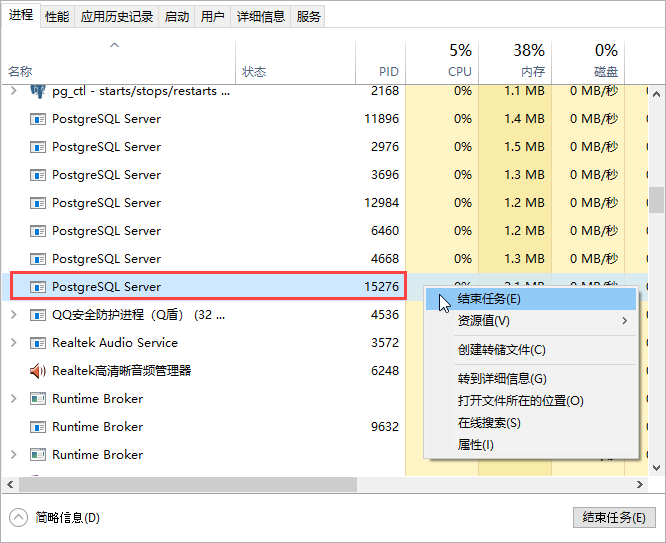 (3) 根据PID编号找到PostgreSQL主进程,并将其结束。