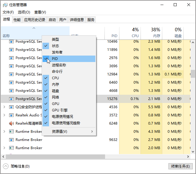 如果任务管理器中没有显示出PID列,可在进程列表的列头上右单击,然后勾选PID将其显示。