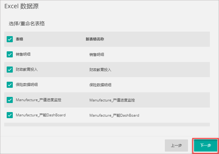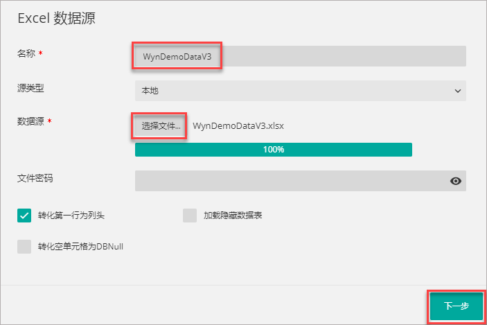 为数据源设置名称为“WynDemoDataV3”并选择本地的 Demo 文件上传,然后单击右下角的“下一步” 按钮。