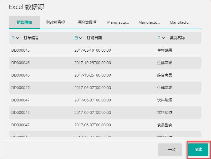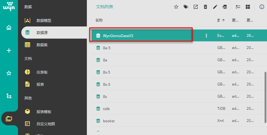 连接到数据源后,在门户网站的“数据源”分类下单击刚创建的数据源,即可查看该数据源中的数据(预览只能显示部分数据)。
