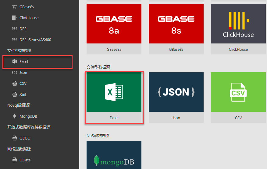 这里我们以Excel数据源为例,在左侧数据源列表或右侧预览视图中选择Excel。(如需了解更多数据源类型,请参见第四章 数据连接)