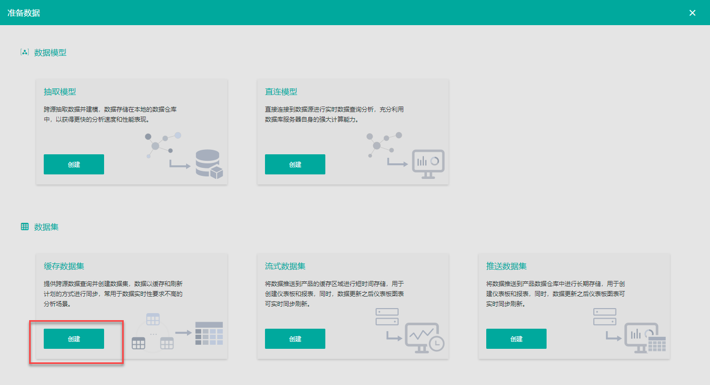 为仪表板准备数据时,支持多种方式。这里我们先选择创建一个缓存数据集。