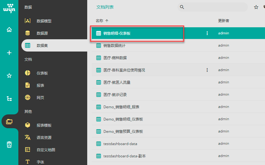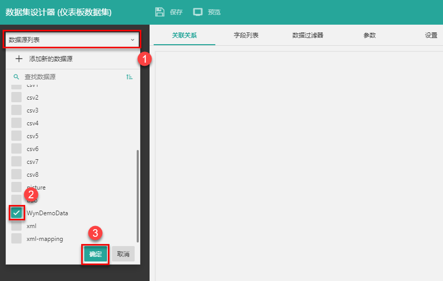添加已创建的数据源,这里我们选择示例数据源“WynDemoData”。