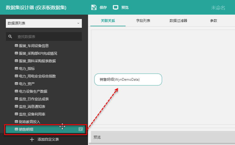 为了让示例的过程足够简单,这里我们仅拖拽一个数据表(销售明细)到编辑区。有关多表关联关系的具体配置介绍,请见多表关联。